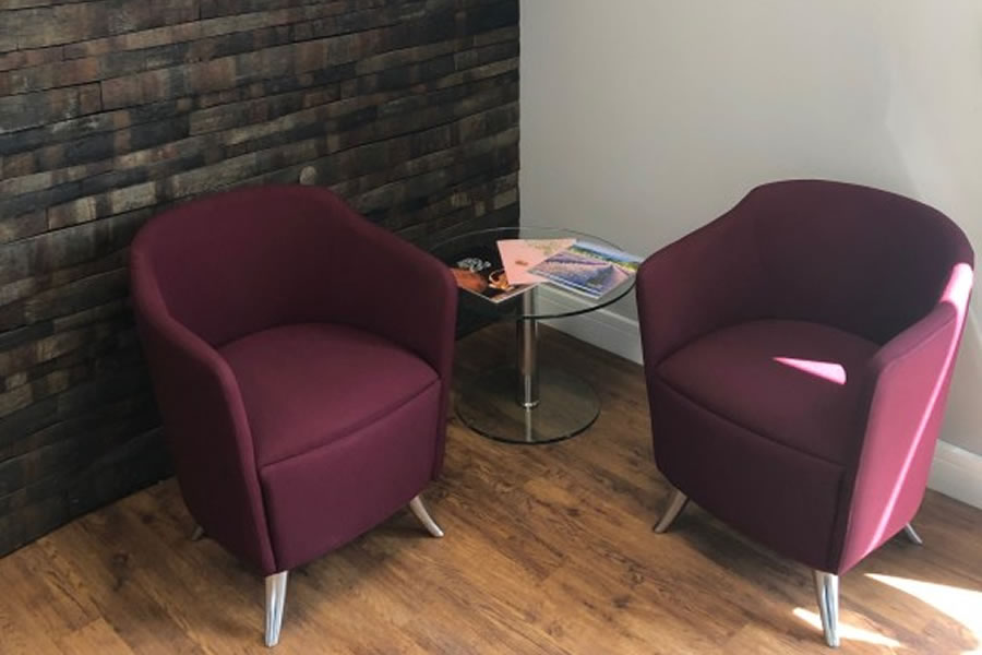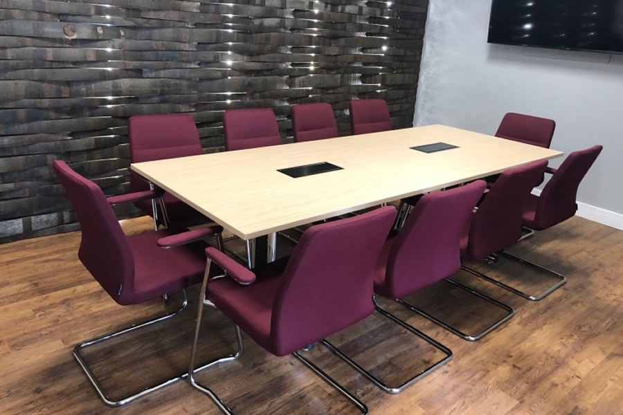 The brief was to design spaces which reflect the quality of their product and service. The reception and main meeting room with their impressive highlight walls, made from oak casks, required furniture to compliment these stunning features. For high quality and timeless looks, we selected the table from our Sven Ambus range. We opted for integrated power and data which gives extra functionality. Then we paired this table with elegant F3 conference armchairs. The polished chrome tubular steel frames and upholstered arms we specified, enhance the appearance.
