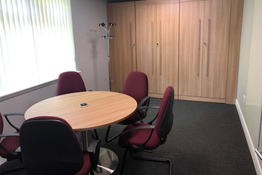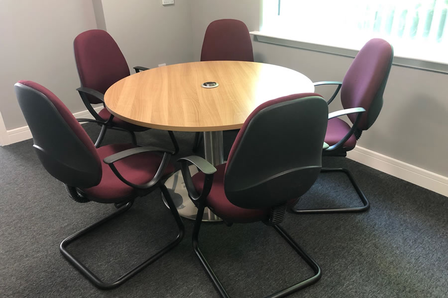 We used Mobili Jack circular table to furnish a further meeting room. The retractable central power module allows for easy connection to technology. Also, to meet the challenge of providing unobtrusive storage, we installed a matching storagewall. We chose Topaz seating from Edge Design for quality, style and functionality. We selected sled base meeting chairs from this range for the meeting room seating.